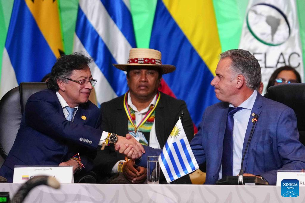 Colombian President Gustavo Petro (L) shakes hands with Uruguayan President Yamandu Orsi during the 10th summit of the Community of Latin American and Caribbean States (CELAC) in Bogota, Colombia, March 21, 2026. The 10th summit of the CELAC opened Saturday in Bogota. (Photo by Andres Moreno/Xinhua)