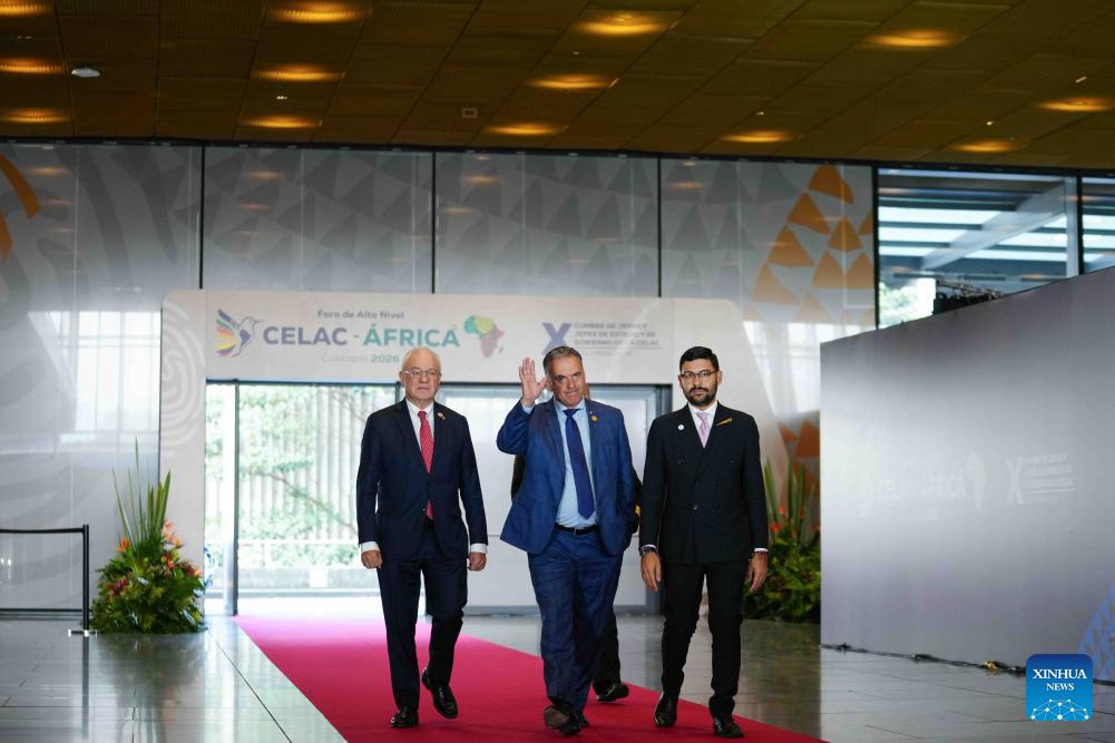 Uruguayan President Yamandu Orsi (C) and Uruguayan Foreign Minister Mario Lubetkin (L) walk into the venue of the 10th summit of the Community of Latin American and Caribbean States (CELAC) in Bogota, Colombia, March 21, 2026. The 10th summit of the CELAC opened Saturday in Bogota. (Photo by Andres Moreno/Xinhua)