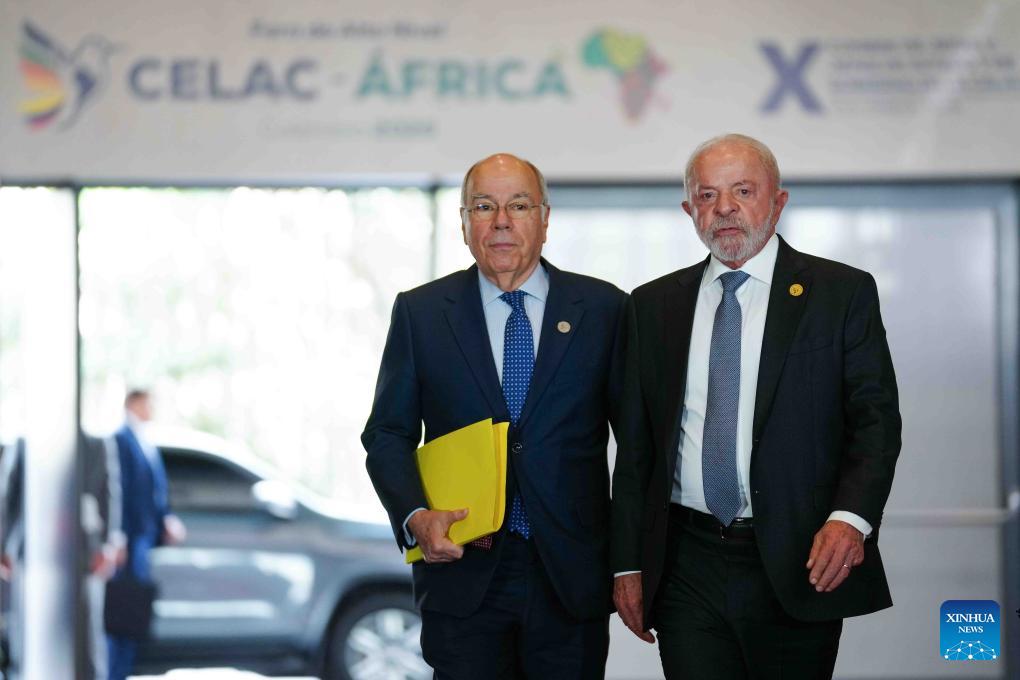 Brazilian President Luiz Inacio Lula da Silva (R) and Brazilian Foreign Minister Mauro Vieira walk into the venue of the 10th summit of the Community of Latin American and Caribbean States (CELAC) in Bogota, Colombia, March 21, 2026. The 10th summit of the CELAC opened Saturday in Bogota. (Photo by Andres Moreno/Xinhua)