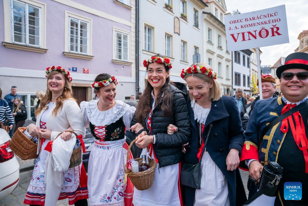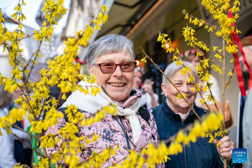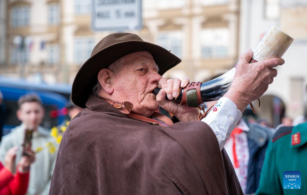 People in traditional costumes take part in a ceremony to welcome spring in Prague, the Czech Republic, on March 22, 2026. A traditional ceremony was held in Prague on Sunday, during which a straw effigy symbolizing winter and death was burnt and then cast into a river, marking the end of winter and the arrival of spring. This folk custom, passed down since ancient times, has become an important cultural symbol of the region. (Photo by Dana Kesnerova/Xinhua)