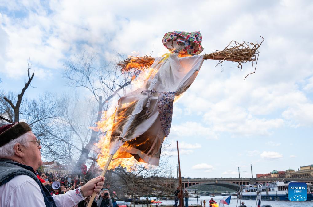 People take part in a ceremony to welcome spring in Prague, the Czech Republic, on March 22, 2026. A traditional ceremony was held in Prague on Sunday, during which a straw effigy symbolizing winter and death was burnt and then cast into a river, marking the end of winter and the arrival of spring. This folk custom, passed down since ancient times, has become an important cultural symbol of the region. (Photo by Dana Kesnerova/Xinhua)