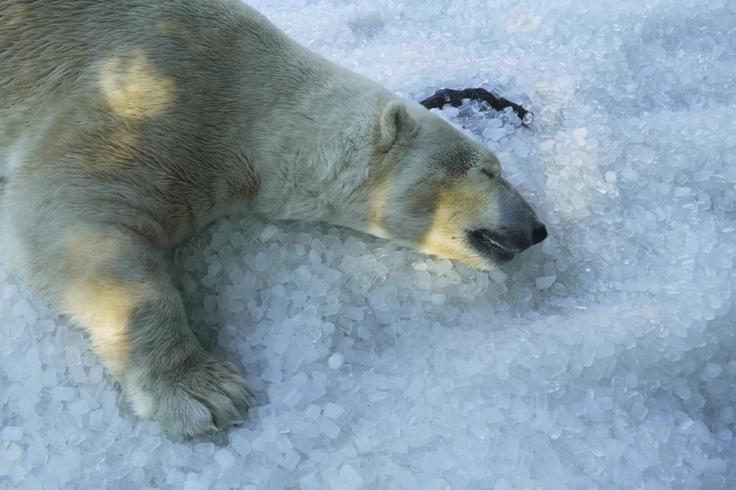 A polar bear cools down on a pile of ice that was brought to its enclosure on a hot and sunny day at the Prague zoo, Czech Republic, July 1, 2025. (Photo: AP)