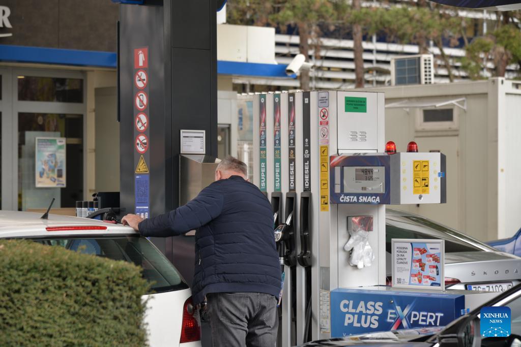 Photo taken on March 23, 2026 shows a man filling up his car at a gas station in Zagreb, Croatia. The Croatian government has decided to extend a fuel price cap for another two weeks amid rising prices linked to the situation in the Middle East, Prime Minister Andrej Plenkovic said on Monday during a government session. (Photo: Xinhua)