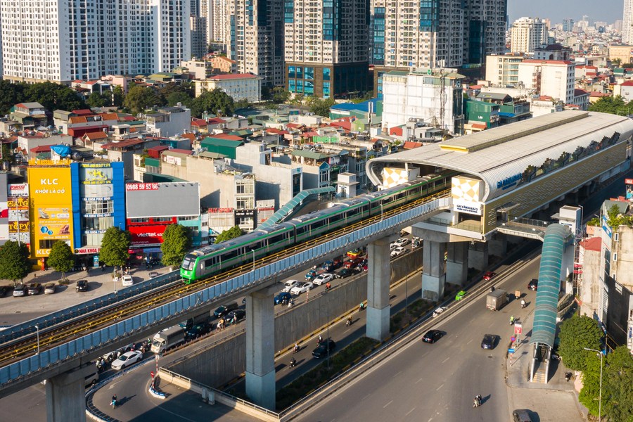 Aerial photo taken on Dec. 1, 2021 shows the train running on the Cat Linh-Ha Dong metro line in Hanoi, capital of Vietnam. (File photo: China Railway Sixth Group Co., Ltd./Handout via Xinhua)