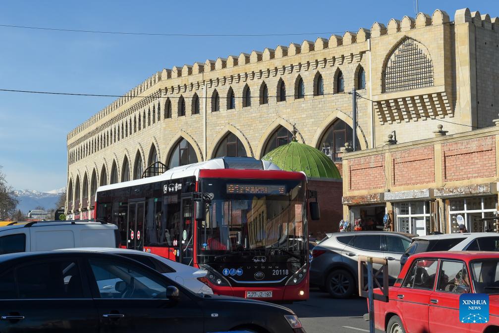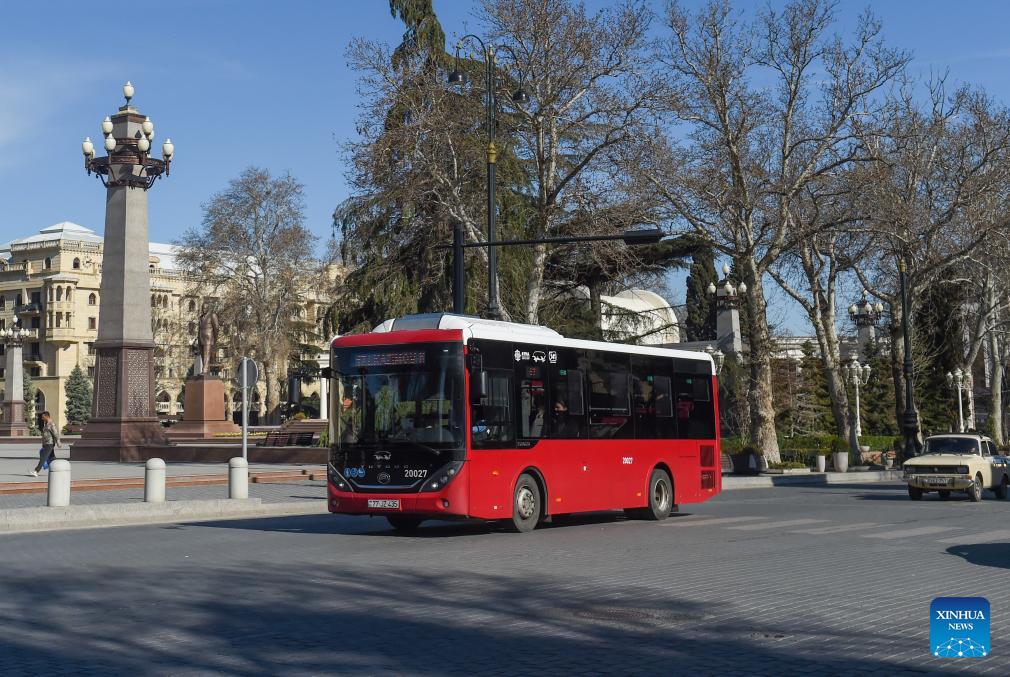 This photo taken on March 24, 2026 shows a Chinese bus running on the street in Ganja City, Azerbaijan. In September 2025, over 230 Yutong buses produced by the Chinese manufacturer Yutong Bus Co., Ltd. were officially delivered to Ganja City, covering about 20 major bus routes in the city. The buses are widely recognized for being environmentally friendly, quiet and reliable. (Xinhua/Chen Junfeng)