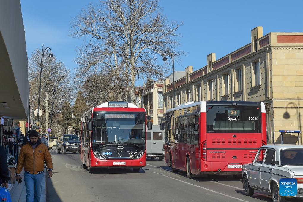 This photo taken on March 24, 2026 shows Chinese buses running on the street in Ganja City, Azerbaijan. In September 2025, over 230 Yutong buses produced by the Chinese manufacturer Yutong Bus Co., Ltd. were officially delivered to Ganja City, covering about 20 major bus routes in the city. The buses are widely recognized for being environmentally friendly, quiet and reliable. (Xinhua/Chen Junfeng)