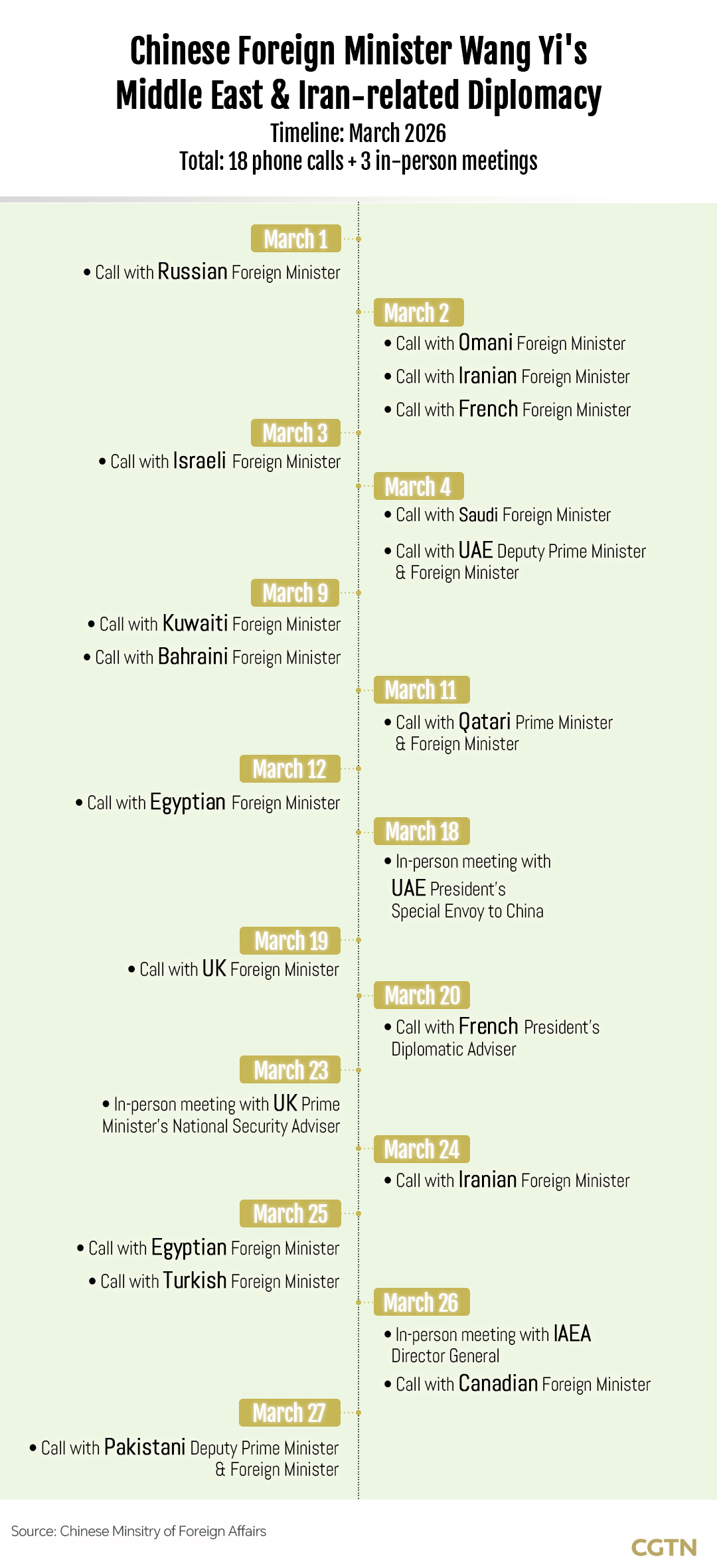 The scale of China's engagement is evident in the calendar of Foreign Minister Wang Yi. From March 1 to 27, Wang held 18 phone calls and three in-person meetings, forging a diplomatic network that stretched from the Gulf to the capitals of the West.