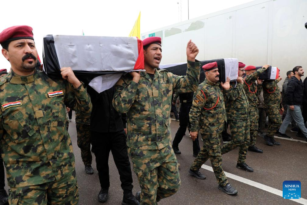People attend a funeral for deceased Iraqi paramilitary Popular Mobilization Forces (PMF) members in Baghdad, Iraq, on March 24, 2026. (Photo: Xinhua)