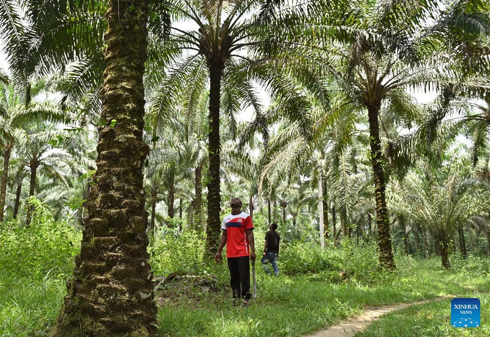 Villagers observe amidst an oil palm forest at Malombo Village, Cameroon, March 27, 2026. (Xinhua/Liu Qiong)