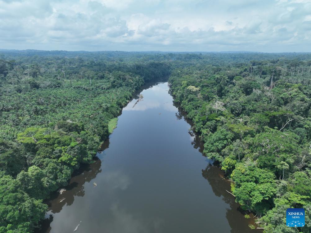An aerial drone photo shows a view of the Nyong River in Cameroon, March 27, 2026. (Xinhua/Liu Qiong)