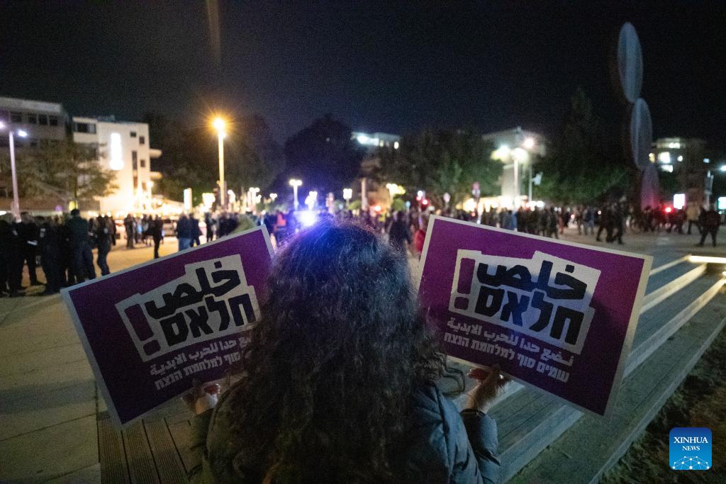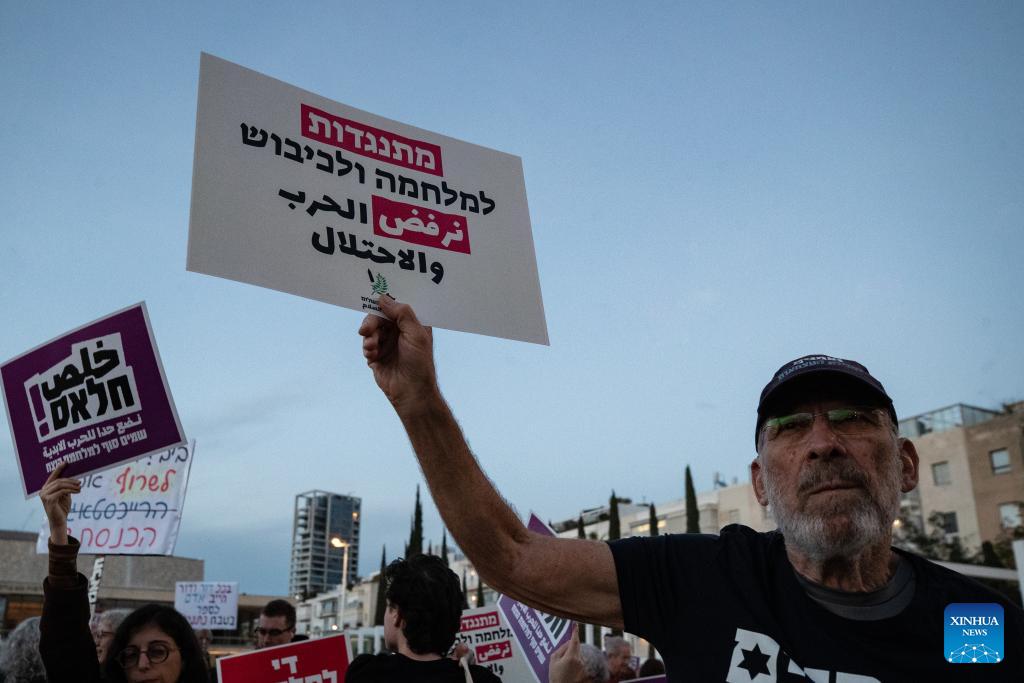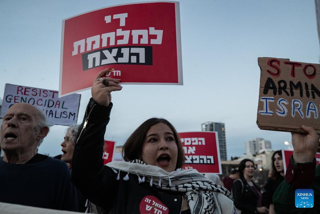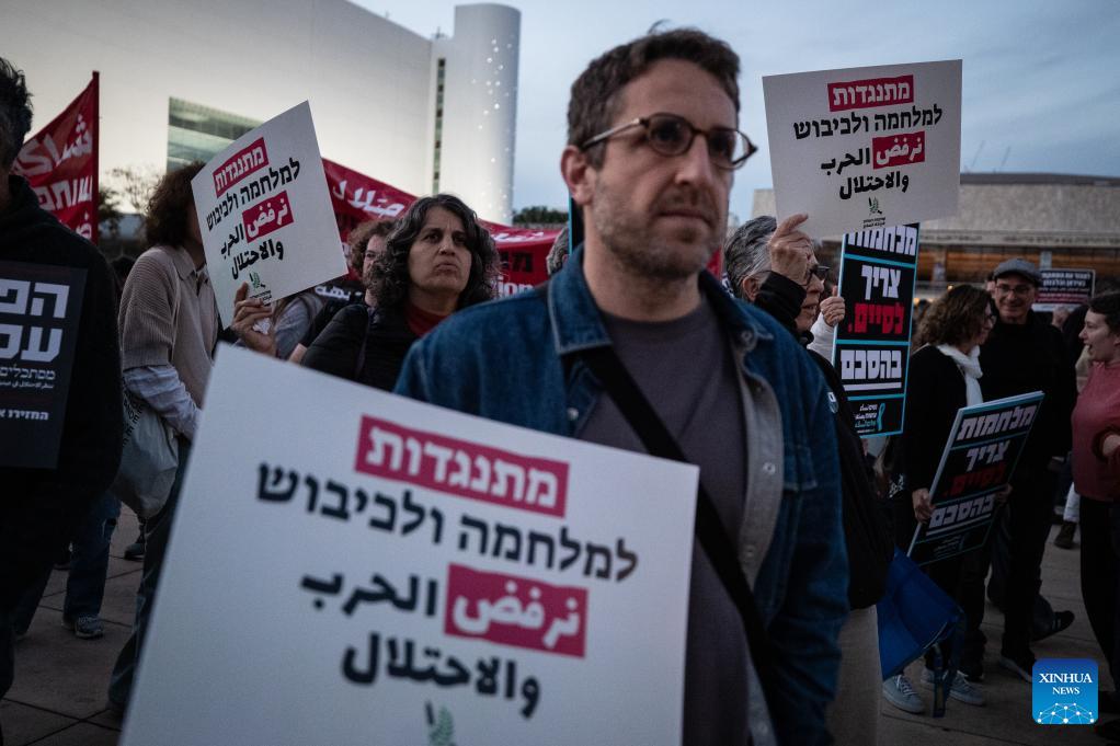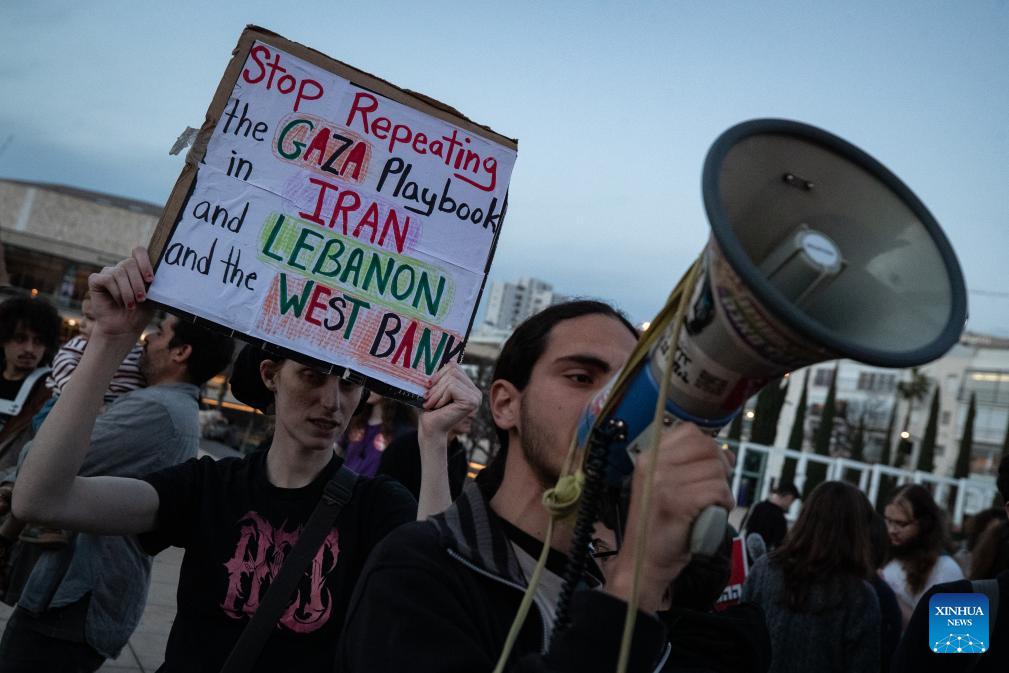 People take part in a protest against war in Tel Aviv, Israel, March 28, 2026. People held protests on Saturday in Tel Aviv to voice opposition to the U.S.-Israeli military operations, calling for an end to all warfare from the two countries. (Xinhua/Chen Junqing)