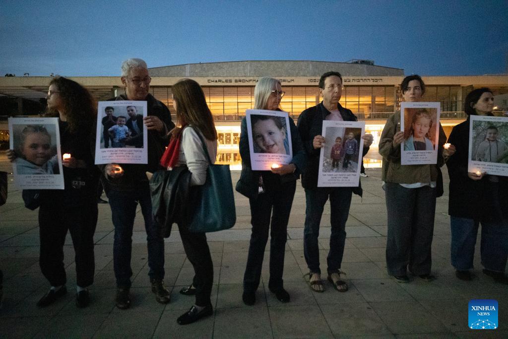 People hold portraits of children killed in wars in Middle East during a protest against war in Tel Aviv, Israel, March 28, 2026. People held protests on Saturday in Tel Aviv to voice opposition to the U.S.-Israeli military operations, calling for an end to all warfare from the two countries. (Xinhua/Chen Junqing)