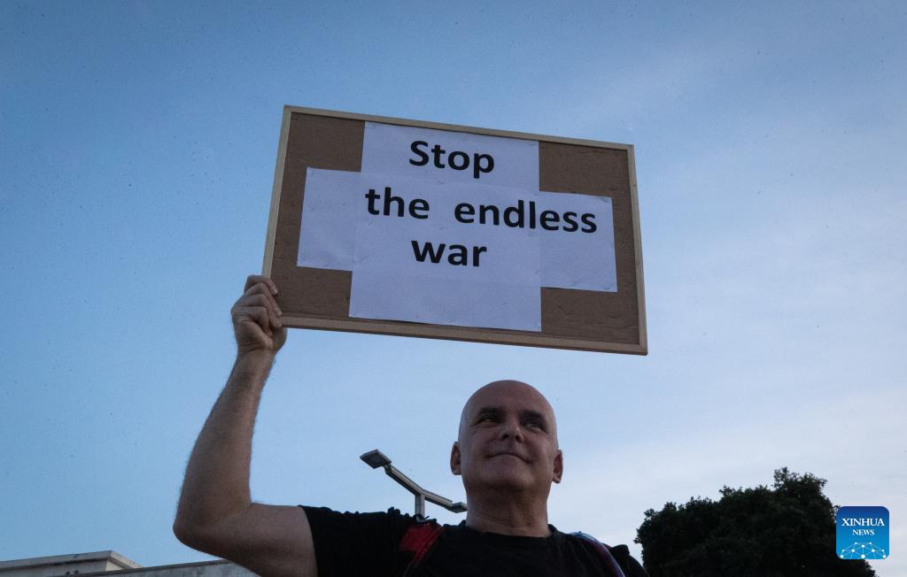A man holds a placard during a protest against war in Tel Aviv, Israel, March 28, 2026. People held protests on Saturday in Tel Aviv to voice opposition to the U.S.-Israeli military operations, calling for an end to all warfare from the two countries. (Xinhua/Chen Junqing)