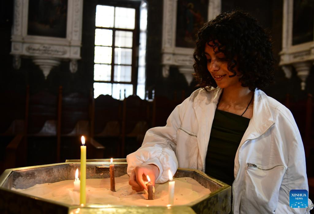 A worshipper lights candles during Palm Sunday services at a church in Damascus, Syria, on March 29, 2026. Palm Sunday is a Christian feast that falls on the Sunday before Easter and marks the beginning of the Holy Week. (Photo by Ammar Safarjalani/Xinhua)