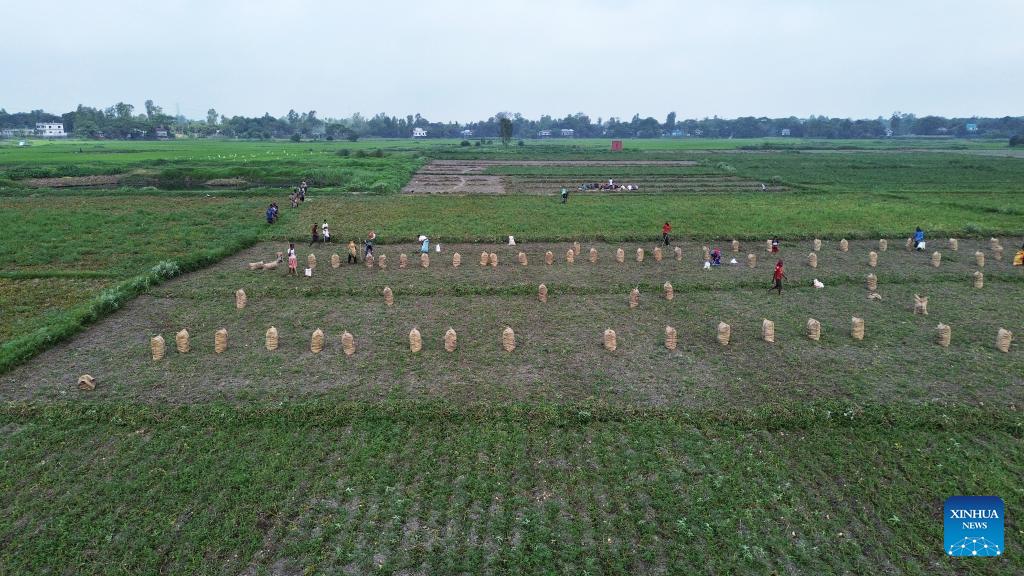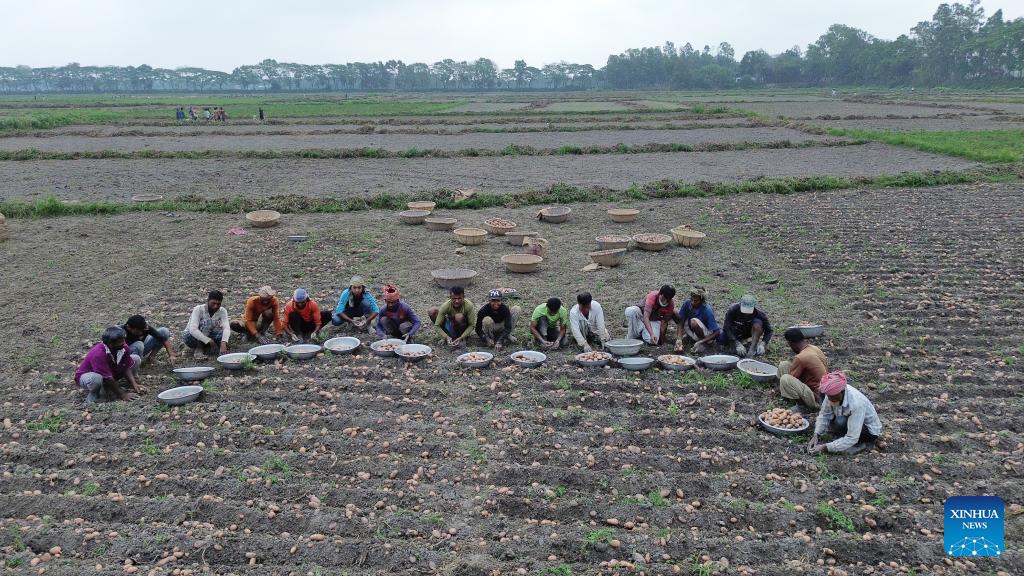 A drone photo taken on April 1, 2026 shows farmers harvesting potatoes in Munshiganj on the outskirts of Dhaka, Bangladesh. Potato production plays an important role in the country's food supply. (Photo by Habibur Rahman/Xinhua)