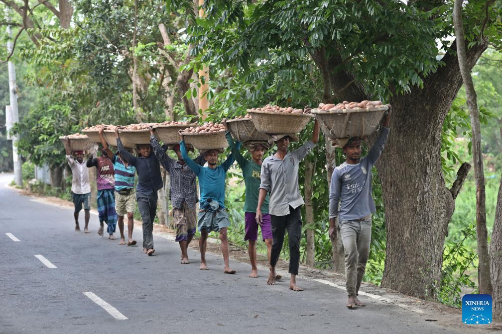 Farmers carry newly-harvested potatoes in Munshiganj on the outskirts of Dhaka, Bangladesh, April 1, 2026. Potato production plays an important role in the country's food supply. (Photo by Habibur Rahman/Xinhua)
