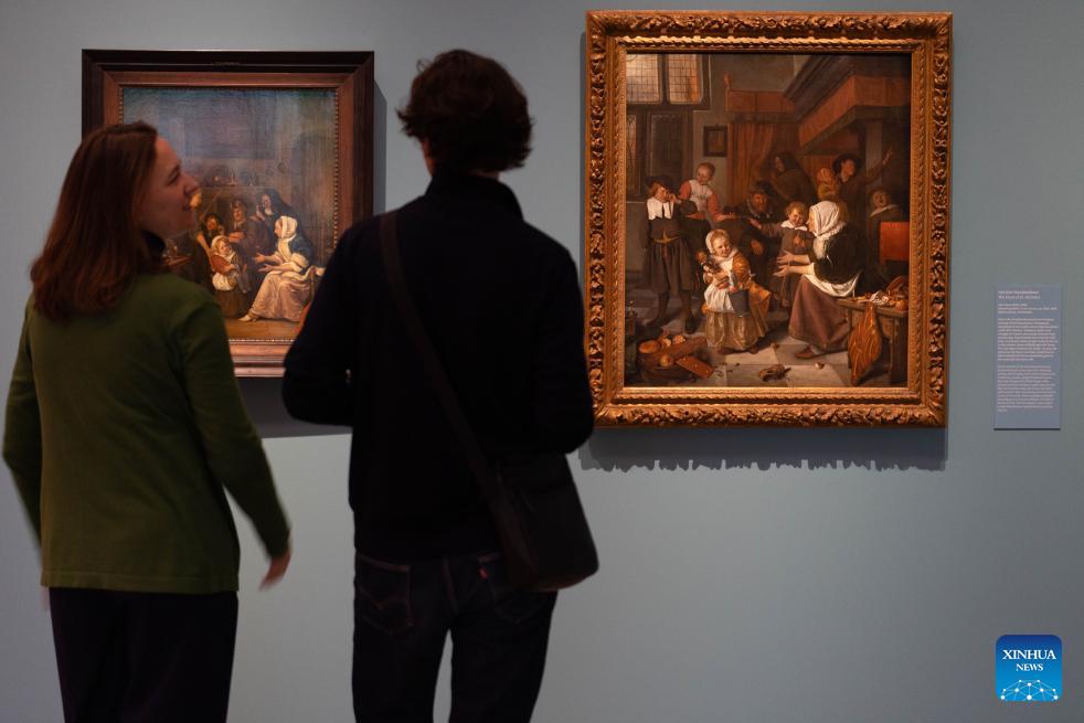 People visit the exhibition "At Home with Jan Steen -- 400 Years of Merrymaking" at the Museum De Lakenhal in Leiden, the Netherlands, on April 1, 2026. The exhibition will open to the public from April 2 to Aug. 23, 2026. Jan Steen was born in 1626 in Leiden and was one of the leading genre painters of the 17th century. (Photo by Sylvia Lederer/Xinhua)