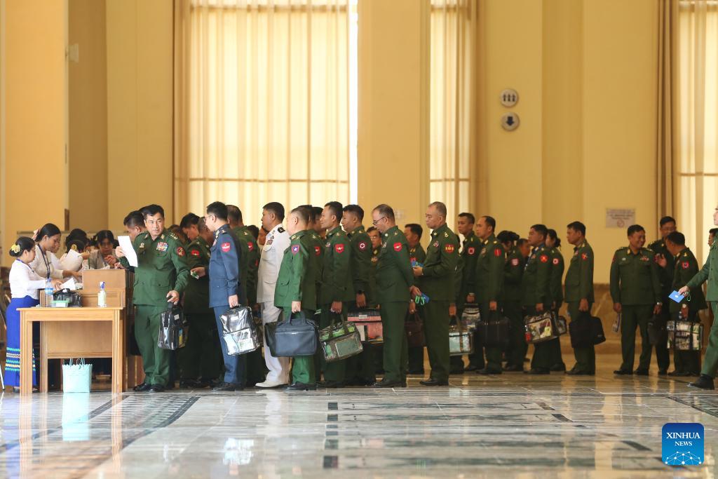 Military representatives arrive for the second day meeting of the first regular session of the Union Parliament in Nay Pyi Taw, Myanmar, April 2, 2026. Myanmar's Union Parliament announced on Thursday that it will elect the country's president on Friday, with three vice presidents having passed the scrutiny of presidential candidate qualifications. (Photo: Xinhua/Myo Kyaw Soe)
