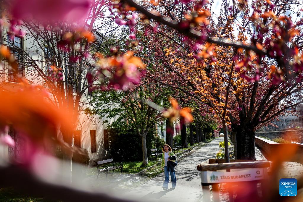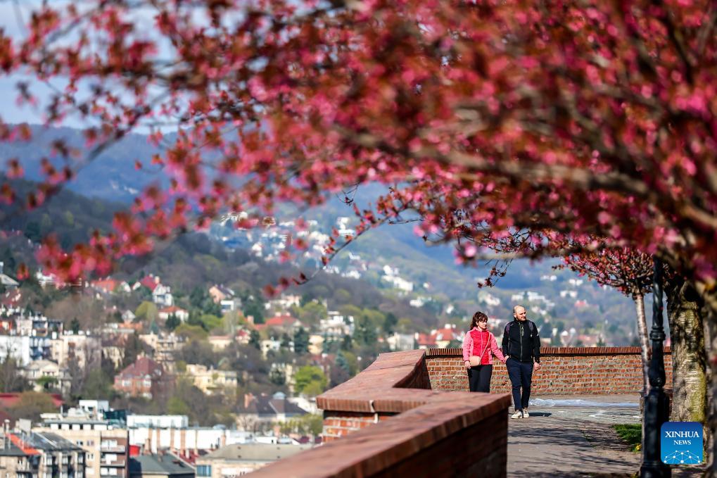 People walk under cherry blossoms at the Castle Hill in Budapest, Hungary, April 2, 2026. (Photo by David Balogh/Xinhua)