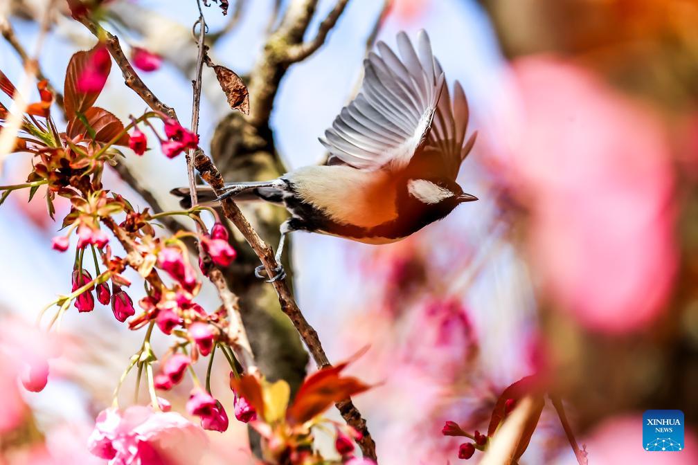 A bird flies away from a blooming cherry tree at the Castle Hill in Budapest, Hungary, April 2, 2026. (Photo by David Balogh/Xinhua)