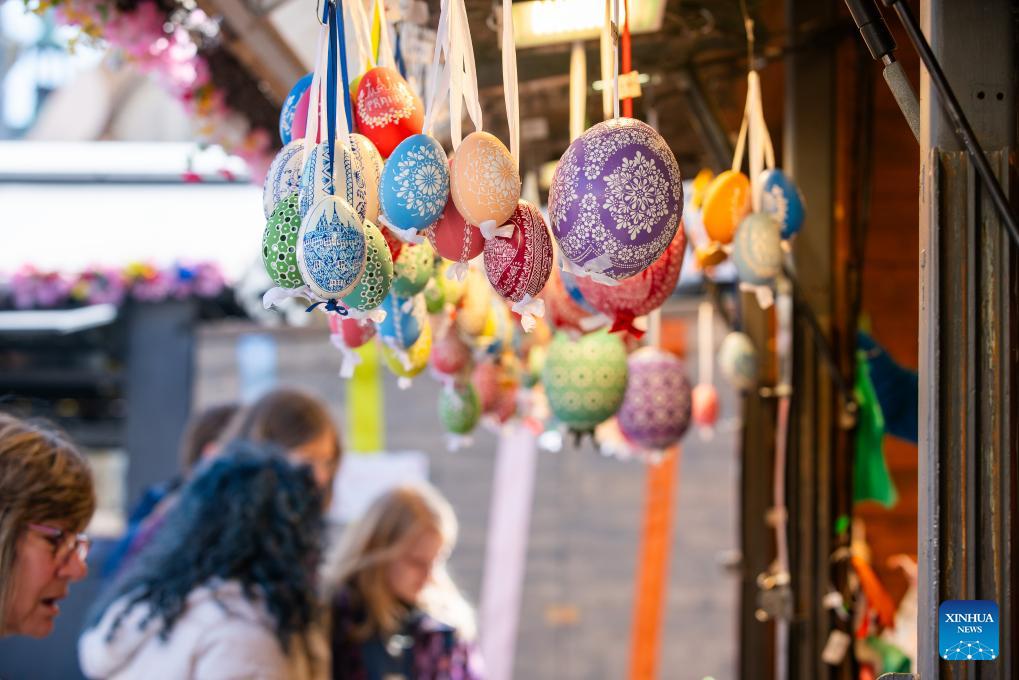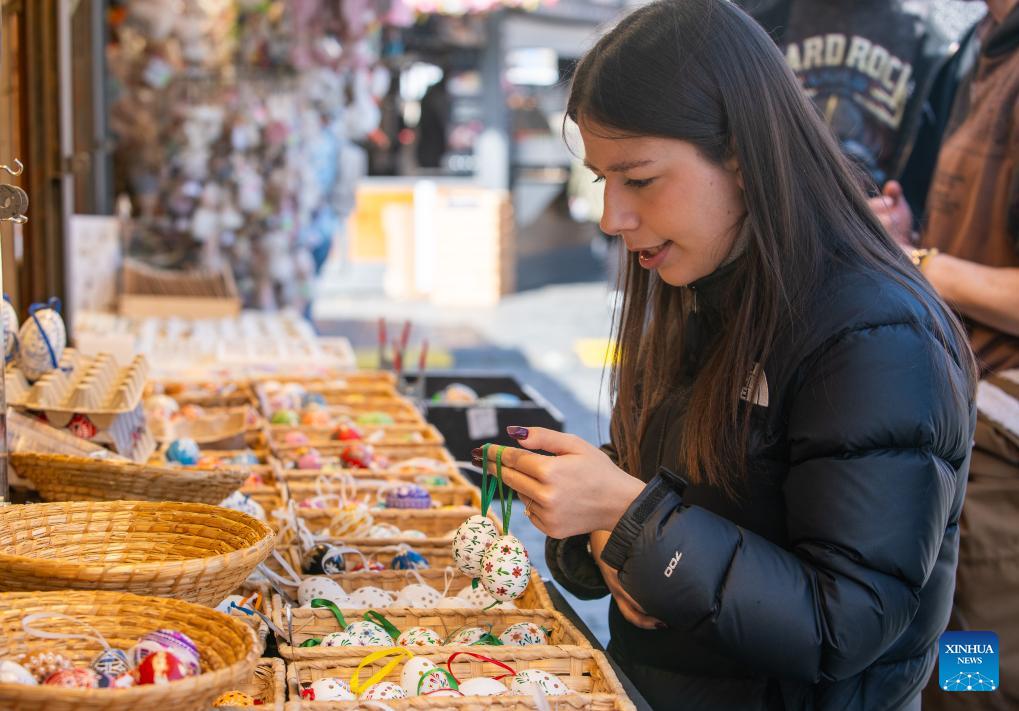 A woman buys festive decorations at an Easter market in Prague, the Czech Republic, April 2, 2026. As Easter approaches, a market is held in Prague's old city, attracting residents and tourists to experience the festive atmosphere. (Photo by Dana Kesnerova/Xinhua)