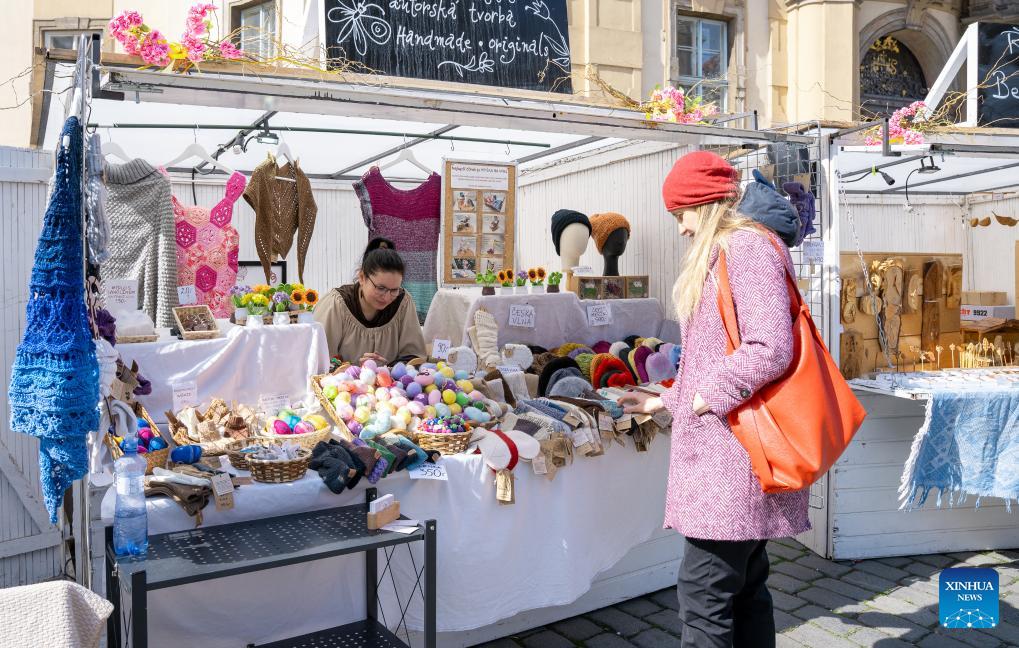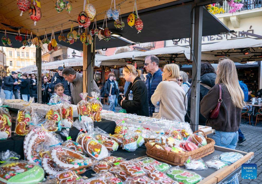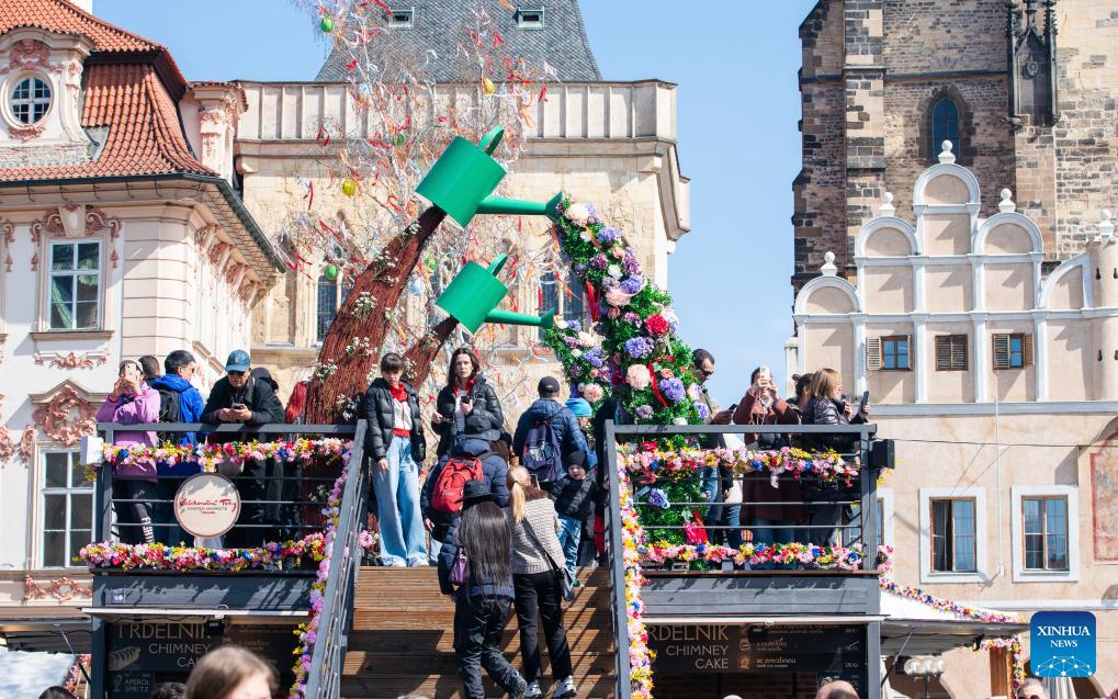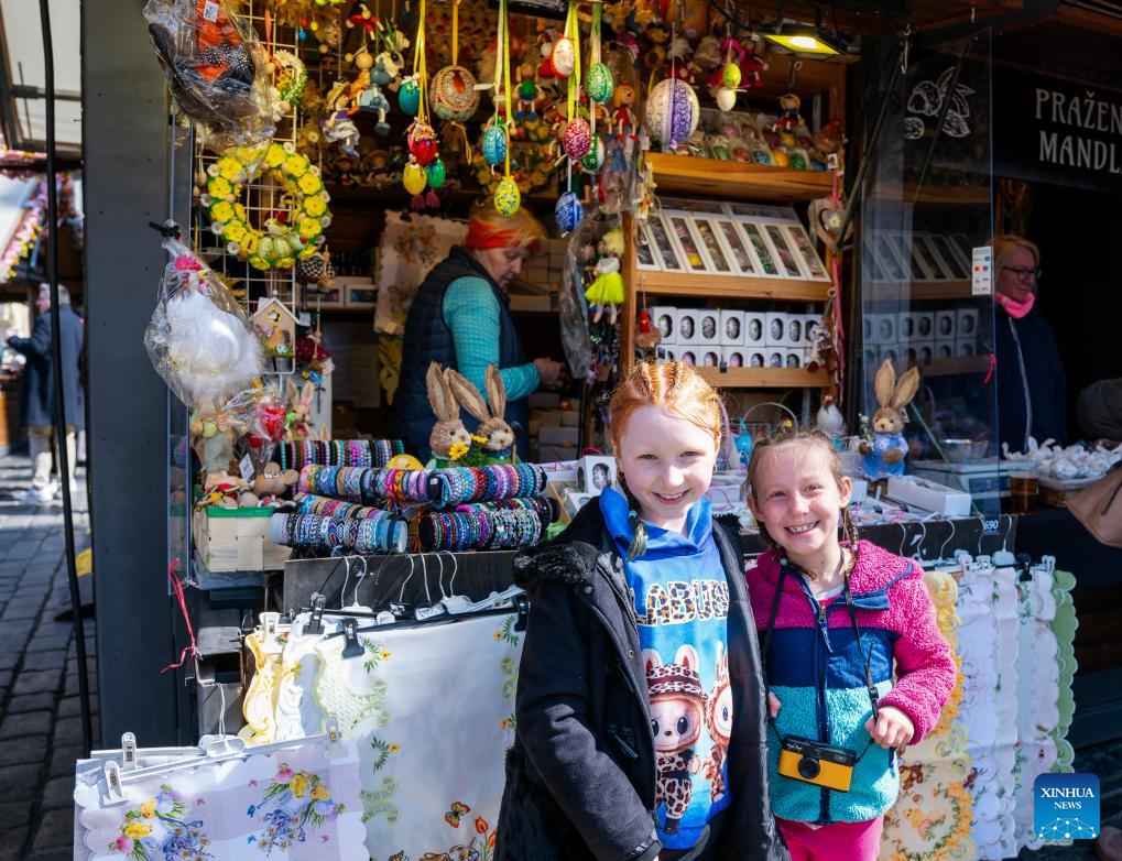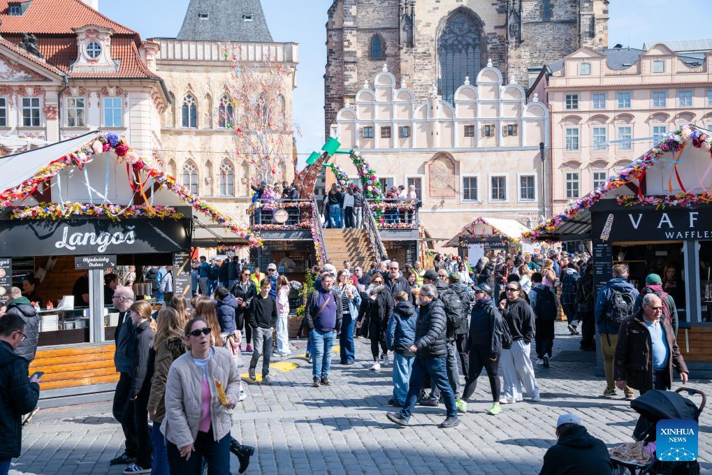 People visit an Easter market in Prague, the Czech Republic, April 2, 2026. As Easter approaches, a market is held in Prague's old city, attracting residents and tourists to experience the festive atmosphere. (Photo by Dana Kesnerova/Xinhua)