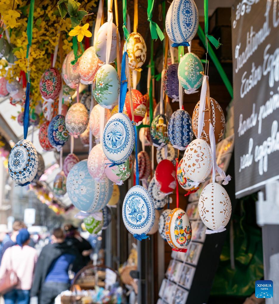 Festive decorations are pictured at an Easter market in Prague, the Czech Republic, April 2, 2026. As Easter approaches, a market is held in Prague's old city, attracting residents and tourists to experience the festive atmosphere. (Photo by Dana Kesnerova/Xinhua)