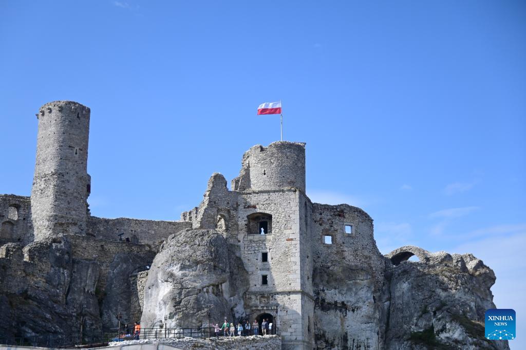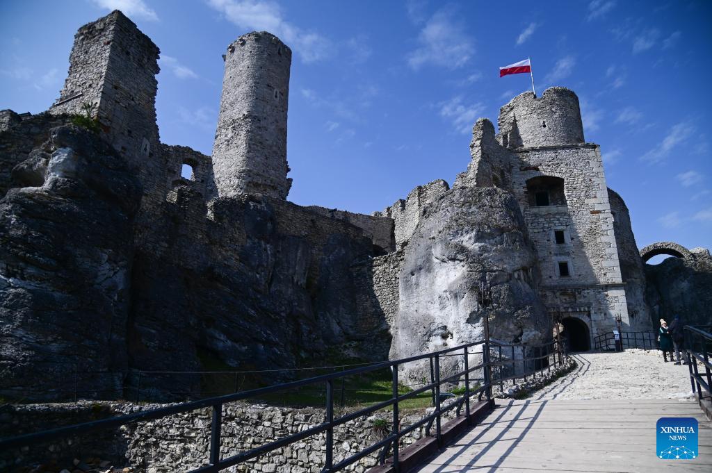 (260403) -- OGRODZIENIEC, April 3, 2026 (Xinhua) -- This photo taken on April 2, 2026 shows the ruins of the Ogrodzieniec Castle in Podzamcze, Poland. Built in the 14th century, the castle is one of the most prominent medieval strongholds along the Trail of the Eagles' Nests. The Trail of the Eagles' Nests is a renowned historical and cultural tourism route in southern Poland. Connecting southern Polish cities of Krakow and Czestochowa, the route stretches about 160 km and features more than 20 medieval castles built on limestone cliffs. (Photo by Aleksy Witwicki/Xinhua)