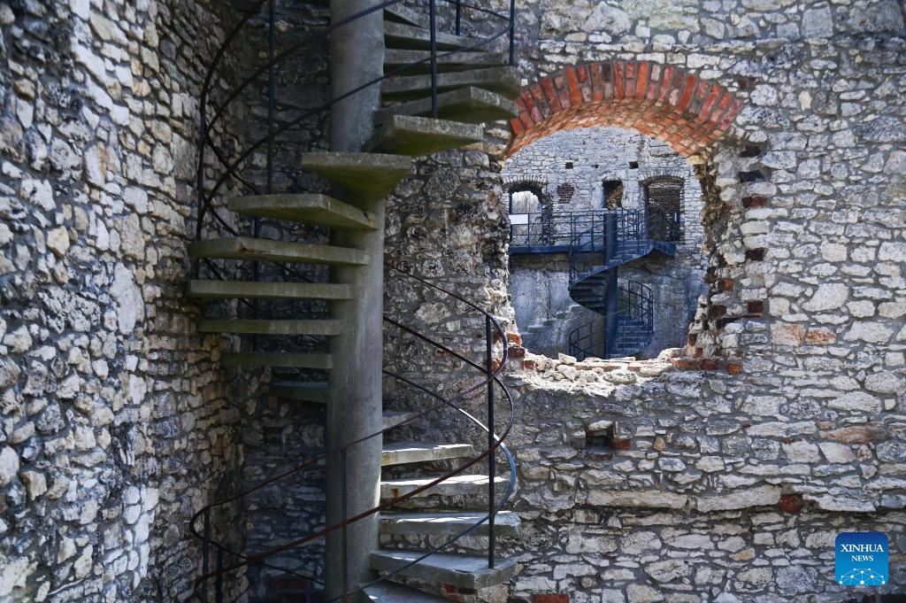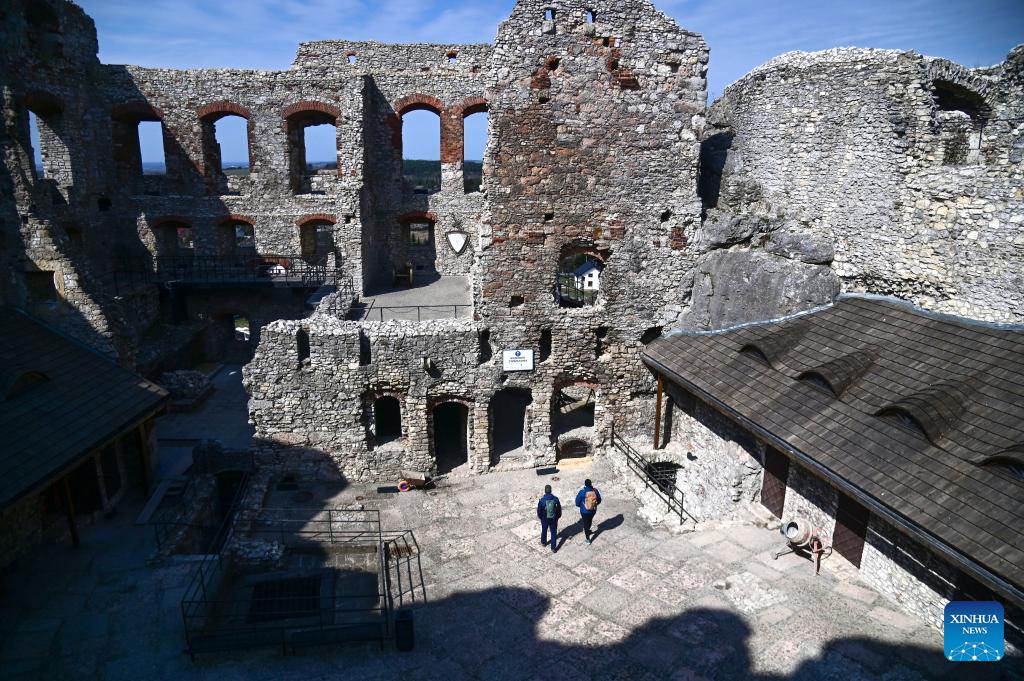 (260403) -- OGRODZIENIEC, April 3, 2026 (Xinhua) -- This photo taken on April 2, 2026 shows an interior of the ruins of the Ogrodzieniec Castle in Podzamcze, Poland. Built in the 14th century, the castle is one of the most prominent medieval strongholds along the Trail of the Eagles' Nests. The Trail of the Eagles' Nests is a renowned historical and cultural tourism route in southern Poland. Connecting southern Polish cities of Krakow and Czestochowa, the route stretches about 160 km and features more than 20 medieval castles built on limestone cliffs. (Photo by Aleksy Witwicki/Xinhua)