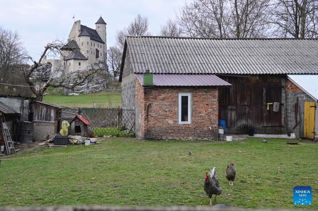 This photo taken on April 2, 2026 shows a rural yard with the Bobolice Castle in the background in Bobolice, Poland. Built in the 14th century, the castle is one of the best-preserved medieval castles along the Trail of the Eagles' Nests. The Trail of the Eagles' Nests is a renowned historical and cultural tourism route in southern Poland. Connecting southern Polish cities of Krakow and Czestochowa, the route stretches about 160 km and features more than 20 medieval castles built on limestone cliffs. (Photo by Aleksy Witwicki/Xinhua)