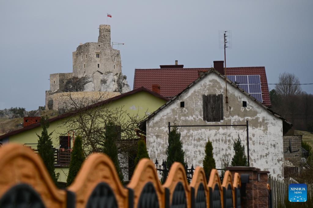 (260403) -- MIROW, April 3, 2026 (Xinhua) -- This photo taken on April 2, 2026 shows the Mirow Castle and nearby residential houses in Mirow, Poland. Built in the mid-14th century, the castle is one of the medieval strongholds along the Trail of the Eagles' Nests. The Trail of the Eagles' Nests is a renowned historical and cultural tourism route in southern Poland. Connecting southern Polish cities of Krakow and Czestochowa, the route stretches about 160 km and features more than 20 medieval castles built on limestone cliffs. (Photo by Aleksy Witwicki/Xinhua)