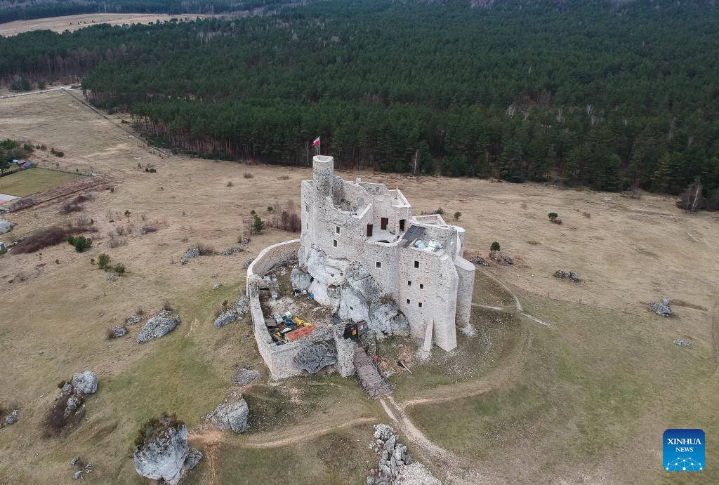 (260403) -- MIROW, April 3, 2026 (Xinhua) -- An aerial drone photo taken on April 2, 2026 shows the Mirow Castle in Mirow, Poland. Built in the mid-14th century, the castle is one of the medieval strongholds along the Trail of the Eagles' Nests. The Trail of the Eagles' Nests is a renowned historical and cultural tourism route in southern Poland. Connecting southern Polish cities of Krakow and Czestochowa, the route stretches about 160 km and features more than 20 medieval castles built on limestone cliffs. (Photo by Aleksy Witwicki/Xinhua)