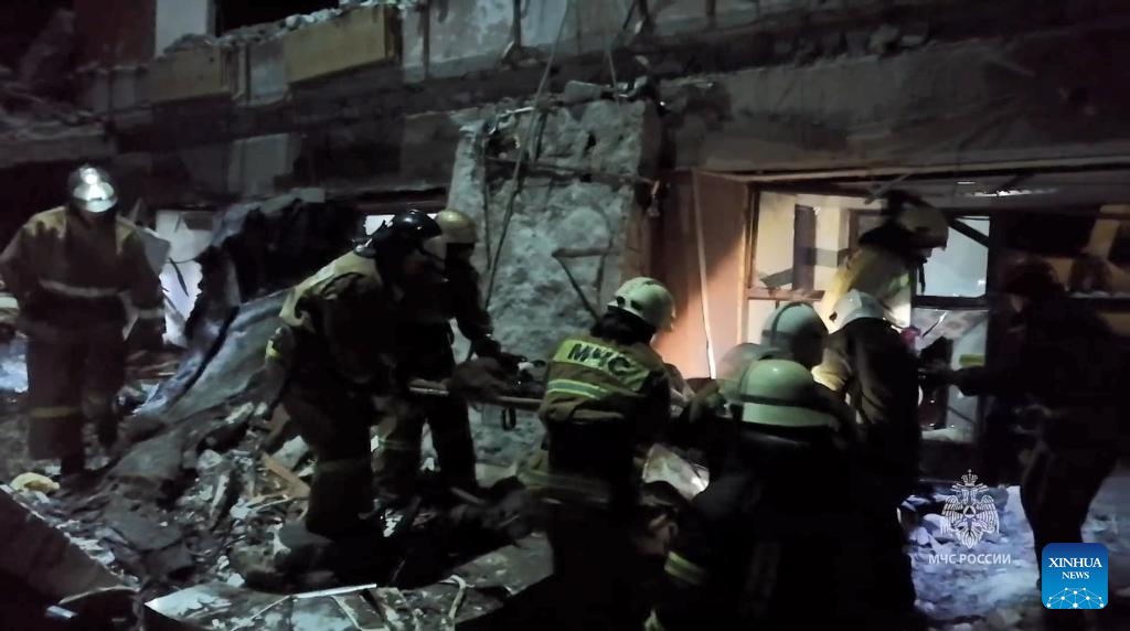A video screenshot released by Russia's Ministry of Emergency Situations shows rescuers working at the site of shelling in the city of Lysychansk in the Lugansk region, Feb. 3, 2024. (File photo: Xinhua)