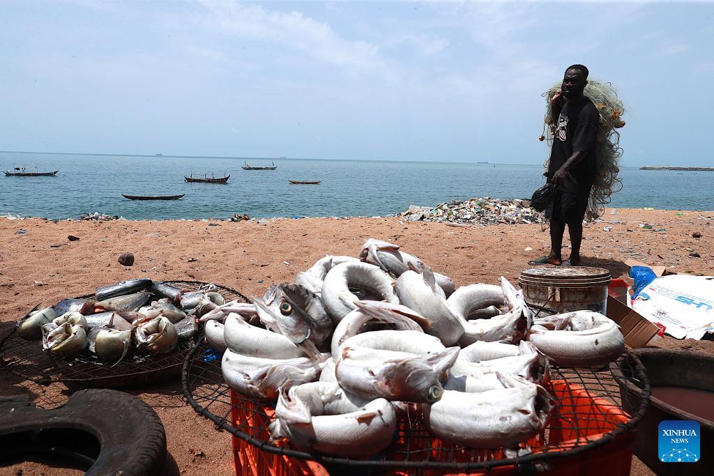 This photo taken on April 3, 2026 shows smoked fish on the beach in Abidjan, Cote d'Ivoire. Along the coastline of Abidjan, fishing is closely intertwined with local community life. (Photo by Yvan Sonh/Xinhua)