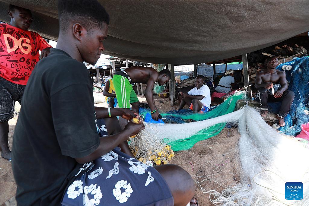 Fishermen repair fishing nets on the beach in Abidjan, Cote d'Ivoire, April 3, 2026. Along the coastline of Abidjan, fishing is closely intertwined with local community life. (Photo by Yvan Sonh/Xinhua)