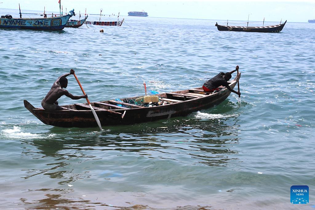 Fishermen row the boat at sea in Abidjan, Cote d'Ivoire, April 3, 2026. Along the coastline of Abidjan, fishing is closely intertwined with local community life. (Photo by Yvan Sonh/Xinhua)