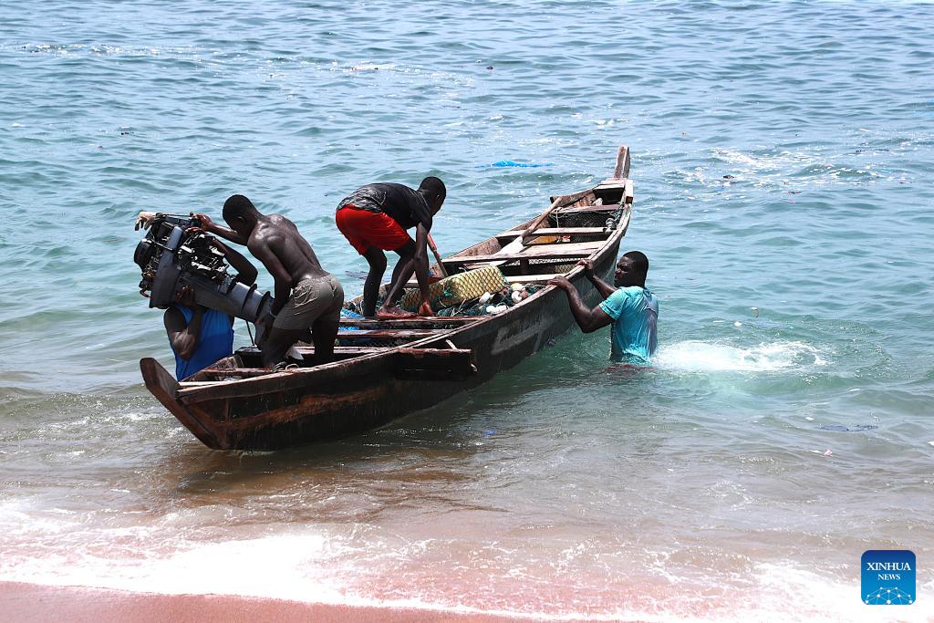 Fishermen load engines onto fishing boats in Abidjan, Cote d'Ivoire, April 3, 2026. Along the coastline of Abidjan, fishing is closely intertwined with local community life. (Photo by Yvan Sonh/Xinhua)