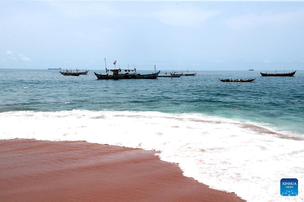 This photo taken on April 3, 2026 shows fishing boats floating at sea in Abidjan, Cote d'Ivoire. Along the coastline of Abidjan, fishing is closely intertwined with local community life. (Photo by Yvan Sonh/Xinhua)
