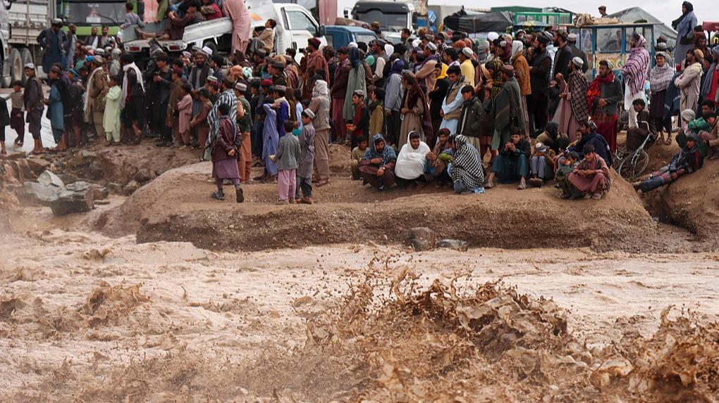 Afghan passengers wait to cross a flooded road in Zawul district, Herat province, as heavy rain causes floods and landslides across multiple provinces in Afghanistan, April 2, 2026. /VCG