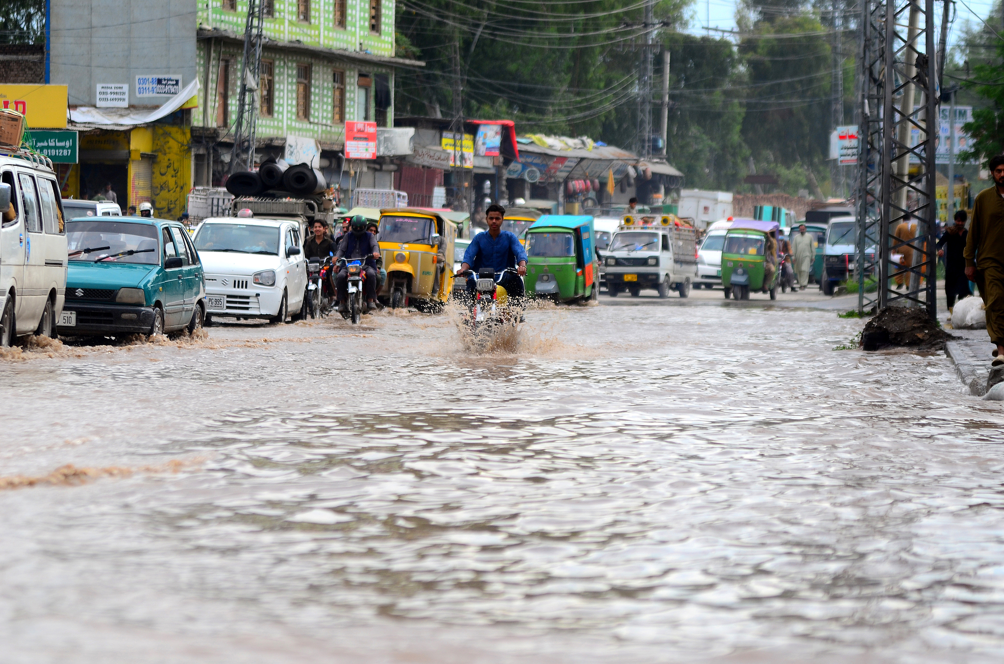 People walk through floodwater in Peshawar, Khyber Pakhtunkhwa, Pakistan, April 4, 2026.
