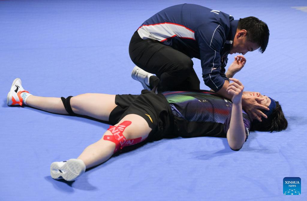 Wang Chuqin celebrates with coach Wang Hao after the men's singles final match between Wang Chuqin of China and Matsushima Sora of Japan at the ITTF Men's and Women's World Cup 2026 in Macao, China, April 5, 2026. (Photo by Cheong Kam Ka/Xinhua)