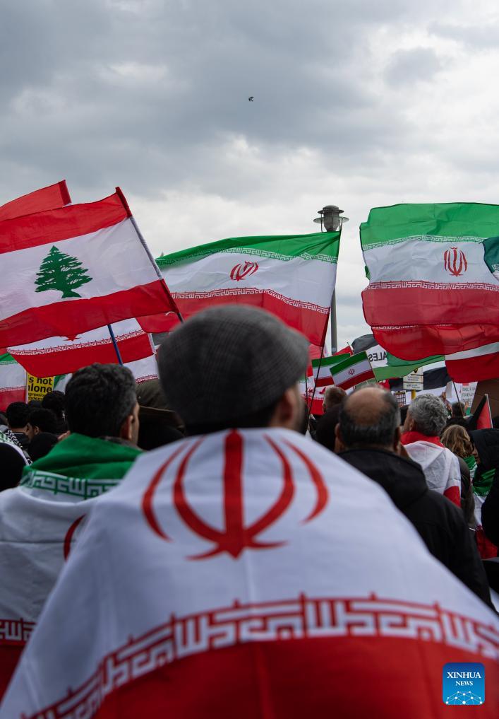 People take part in a demonstration against the military actions launched by the United States and Israel against Iran and other countries outside the main train station in Berlin, Germany, April 5, 2026. (Xinhua/Zhang Haofu)