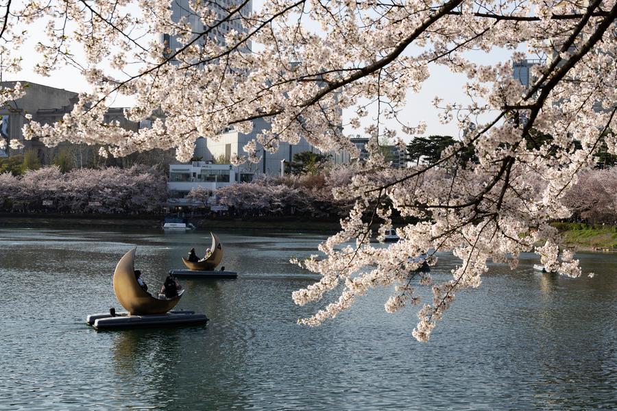 This photo taken on April 5, 2026 shows cherry blossoms by the Seokchon Lake in Seoul, South Korea. (Photo: Xinhua)