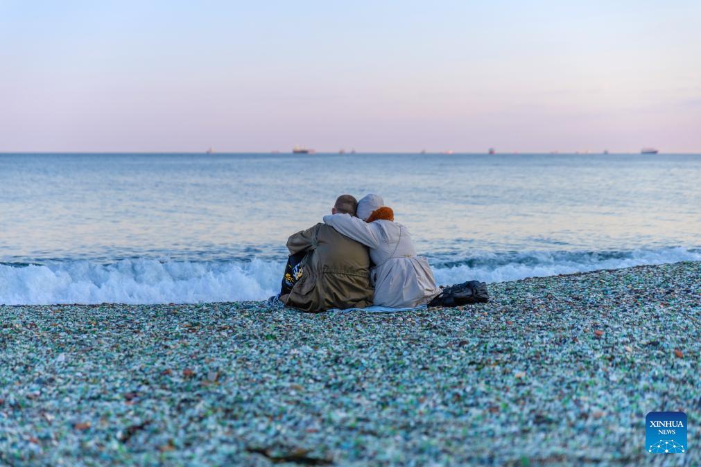 People sit on Glass Beach in Ussuri Bay, Vladivostok, Russia, April 7, 2026. (Photo by Andrey Matveenko/Xinhua)