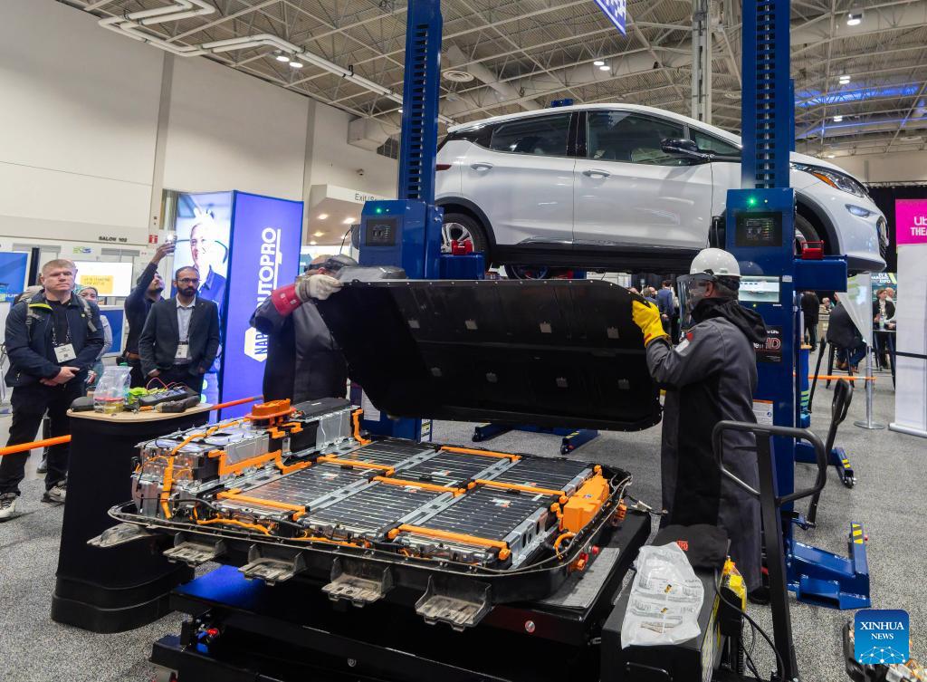 Technicians demonstrate the battery structure of an electric vehicle (EV) during the EV & Charging Expo 2026 in Toronto, Canada, on April 8, 2026. Exploring electric vehicles and charging solutions for fleets, buildings and commercial sites, the two-day event kicked off here on Wednesday, with about 2,000 attendees from more than 800 organizations. (Photo by Zou Zheng/Xinhua)