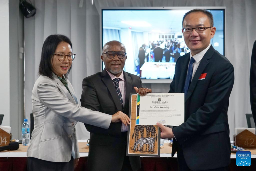 Seif Shekalaghe (C), permanent secretary of Tanzania's Ministry of Health, presents a certificate of appreciation to a team member of the 27th Chinese medical team in Tanzania, in Dar es Salaam, Tanzania, April 8, 2026. (Xinhua/Lin Guangyao)