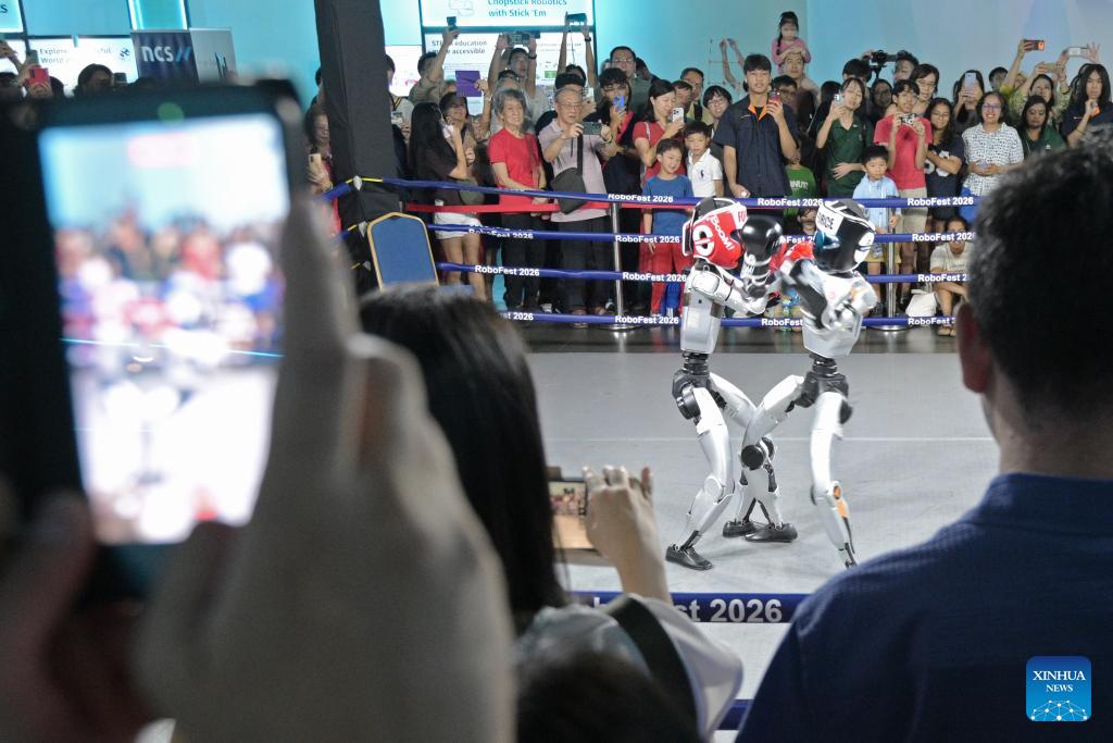 Robots compete during a boxing game during the "RoboFest 2026: Meet Tomorrow, Today" at Science Centre Singapore in Singapore, April 9, 2026. The RoboFest 2026 is dedicated to robotics and AI. (Photo by Then Chih Wey/Xinhua)