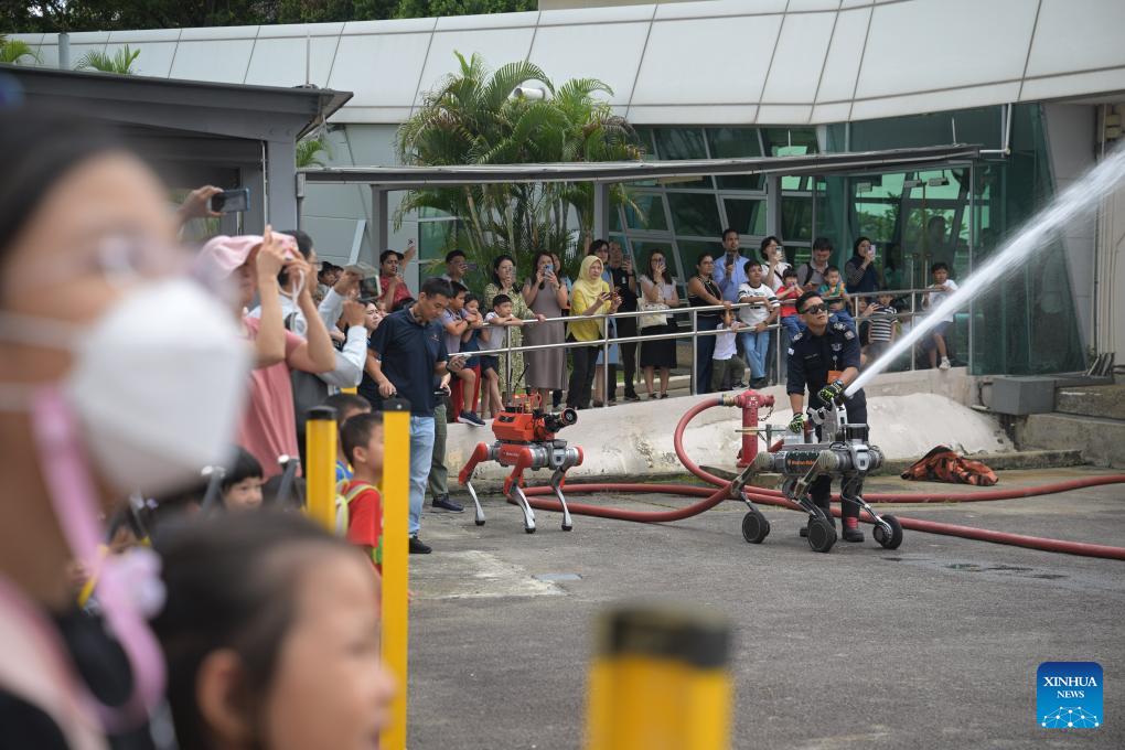 A robotic dog demonstrates firefighting capability during the "RoboFest 2026: Meet Tomorrow, Today" at Science Centre Singapore in Singapore, April 9, 2026. The RoboFest 2026 is dedicated to robotics and AI. (Photo by Then Chih Wey/Xinhua)