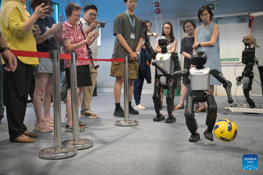 A robot plays football during the "RoboFest 2026: Meet Tomorrow, Today" at Science Centre Singapore in Singapore, April 9, 2026. The RoboFest 2026 is dedicated to robotics and AI. (Photo by Then Chih Wey/Xinhua)