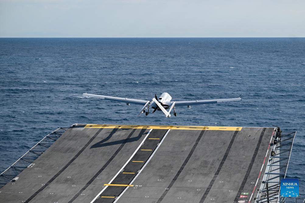 A Bayraktar TB3 drone, a Turkish carrier-based medium-altitude long-endurance unmanned combat aerial vehicle, takes off during the live-fire phase of the "Blue Homeland-2026" tactical military exercises in the eastern Mediterranean Sea, off the coast of Antalya, Türkiye, April 9, 2026. (Mustafa Kaya/Handout via Xinhua)